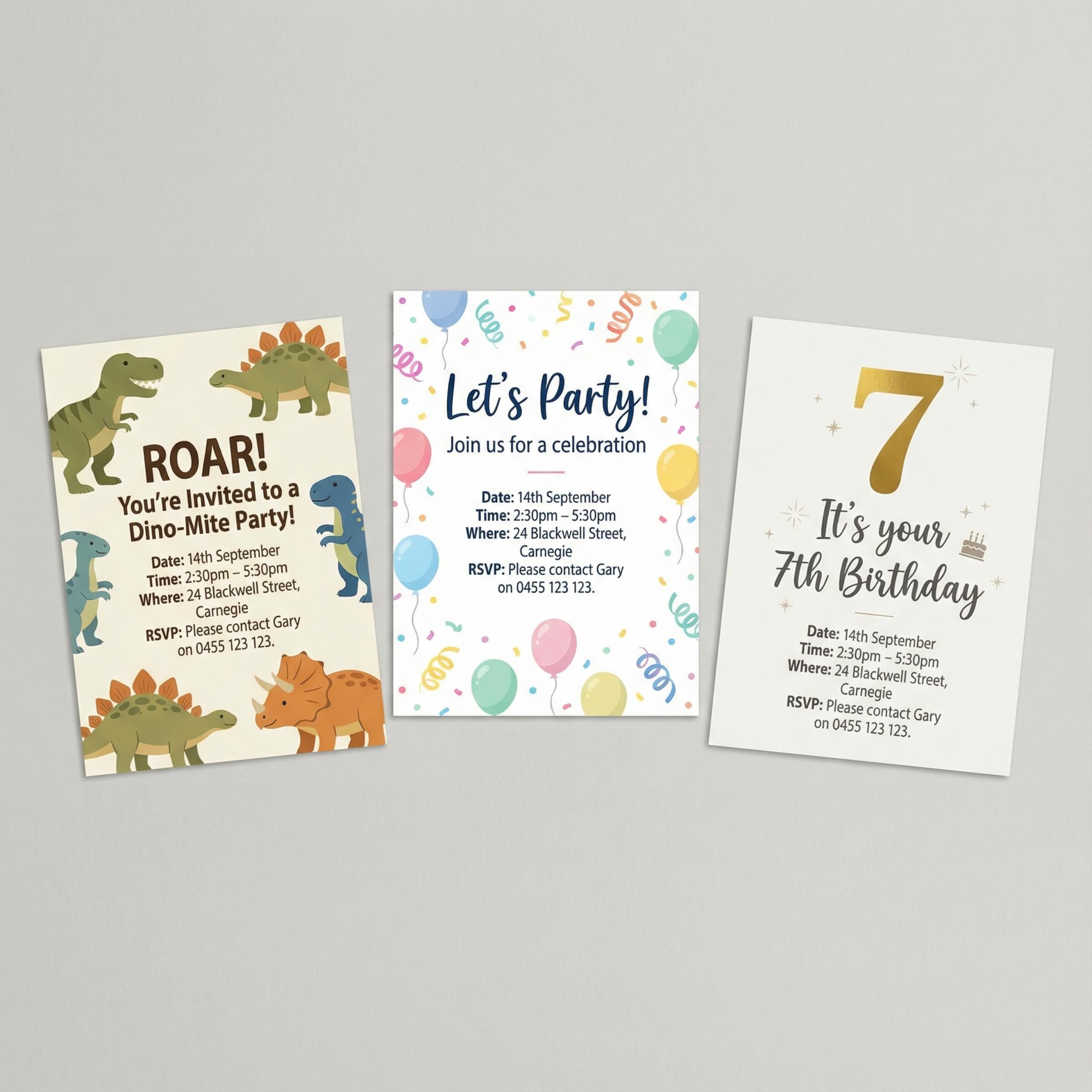 A set of print-at-home party invitations, professionally prepared for you so there’s nothing to fill in manually. We’ll customise all the key details, including the address, date, time, and RSVP information, so your invitations are ready to use as soon as you receive them.