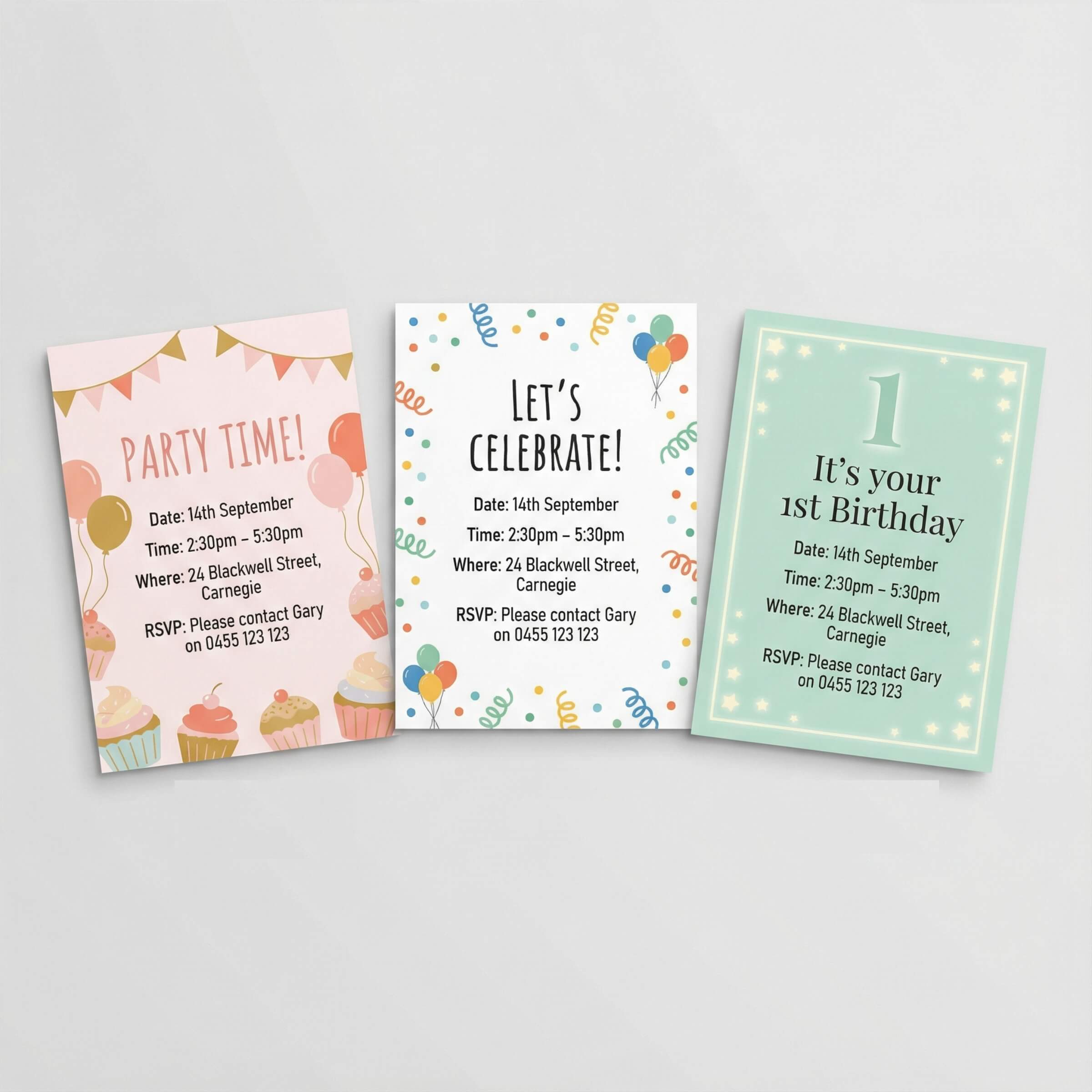 A set of print-at-home party invitations, professionally prepared for you so there’s nothing to fill in manually. We’ll customise all the key details, including the address, date, time, and RSVP information, so your invitations are ready to use as soon as you receive them.